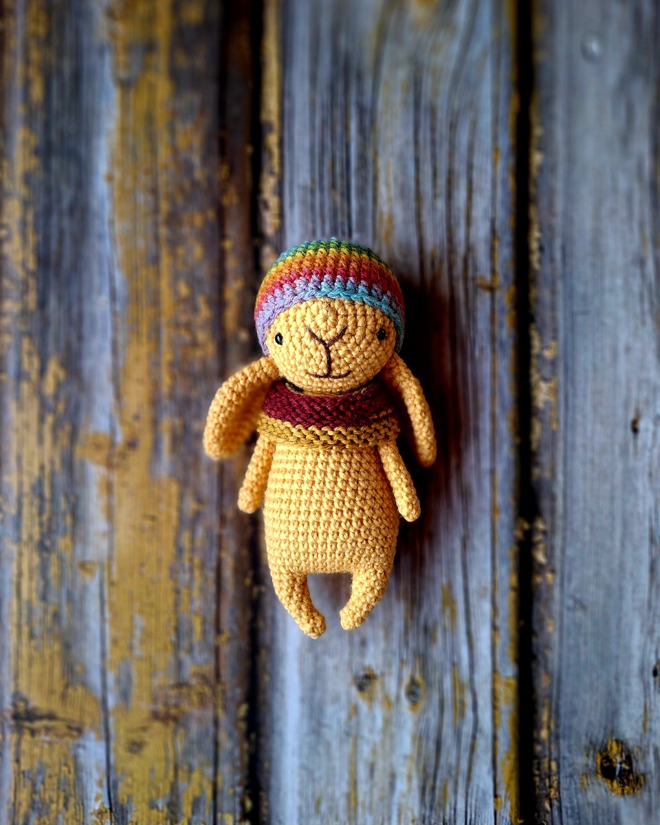 Rõõmsates toonides lõngast valmistatud pehme mänguasi kannab endas käsitöö soojust ja hubasust.